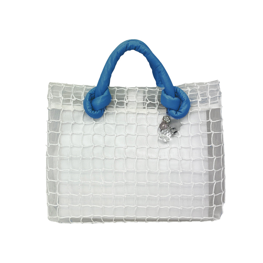 ナイロンチュールにコルダ糸を刺繍したスクエアネット。透け感を楽しめるバッグです。ゆらゆら可愛いチャームはカラーによって変わります。持ち手は革を使用しているので、軽やかなのにしっかりとした印象です。内側にポケットがあるのでバッグの中身は外から見えず安心して使えます。