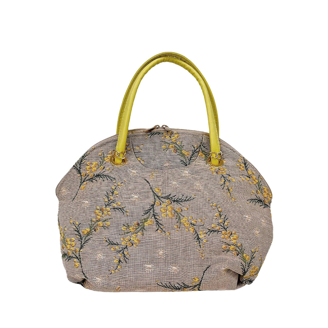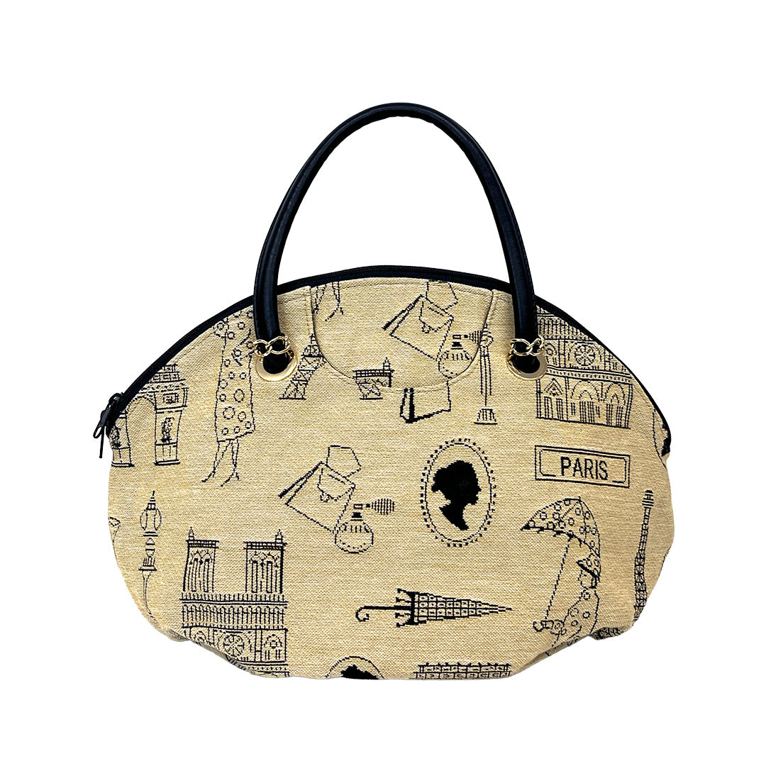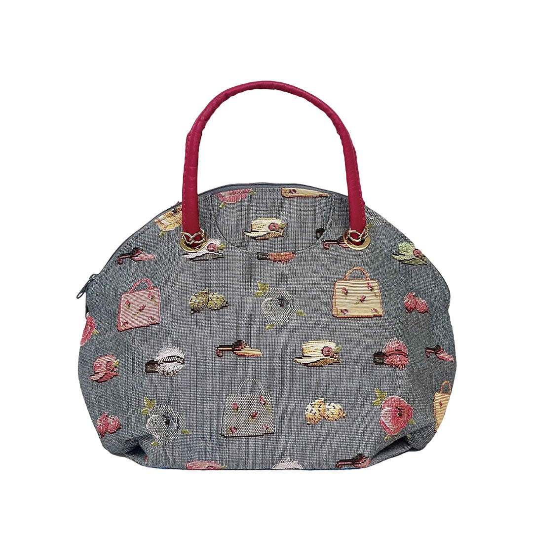 ゴブラン織のハンドバッグ。底マチがたっぷりあるからコンパクトながらも収納力バツグン。両開きファスナーがしっかり開くので中身が取り出しやすいのもポイントです。半月のような丸く優しいデザインながらかっちりとフォーマルにも使えるデザインが特徴の人気のバッグです。