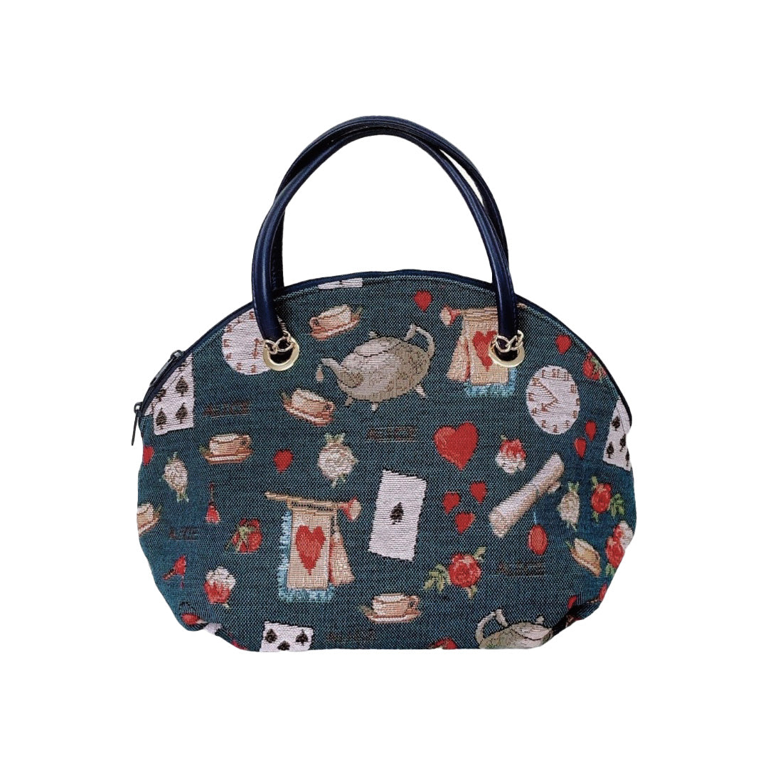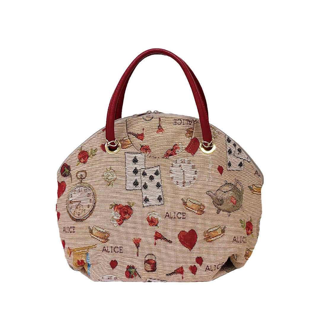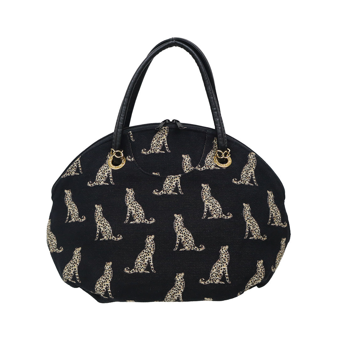 ゴブラン織のハンドバッグ。底マチがたっぷりあるからコンパクトながらも収納力バツグン。両開きファスナーがしっかり開くので中身が取り出しやすいのもポイントです。半月のような丸く優しいデザインながらかっちりとフォーマルにも使えるデザインが特徴の人気のバッグです。