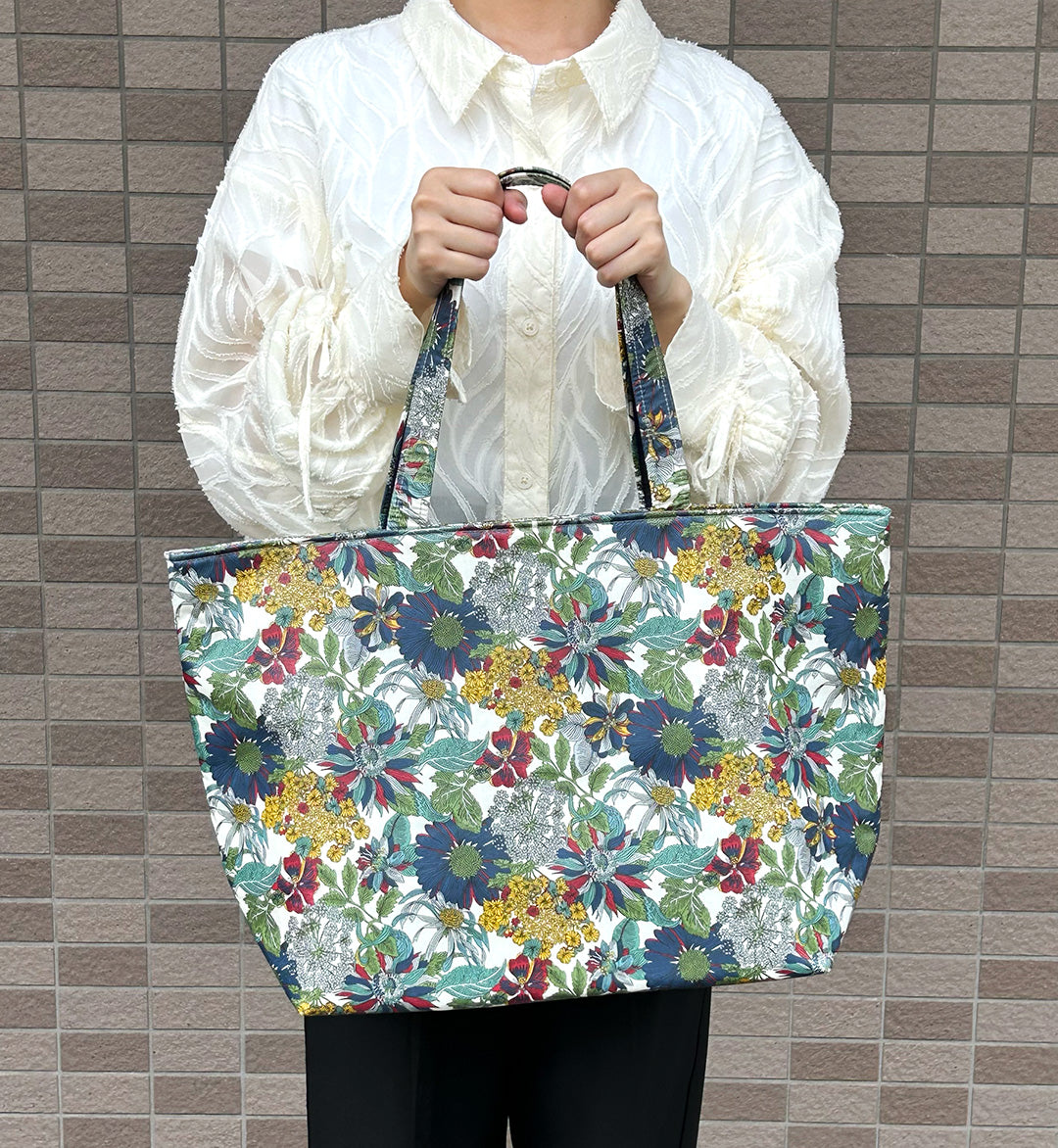人気リバティシリーズのカルチャーバッグ!タナローンにラミネート加工をしているので、雨の日も便利にお使いいただけます♪ 軽さが魅力的な大きめトートバッグは、旅行やジム、習い事にぴったりです。