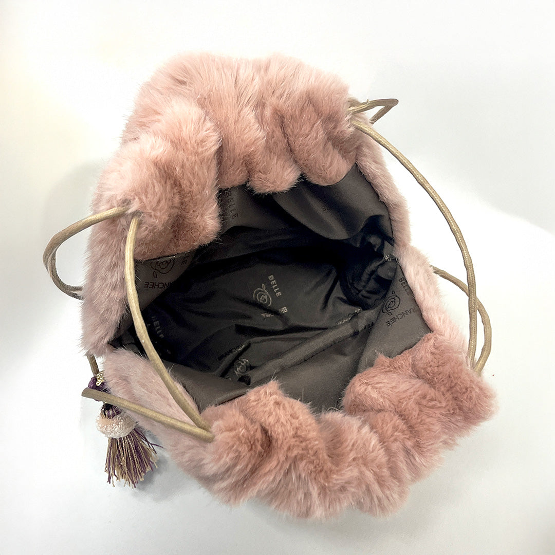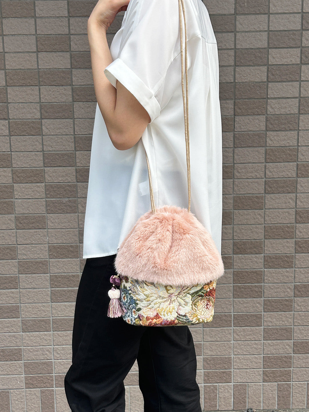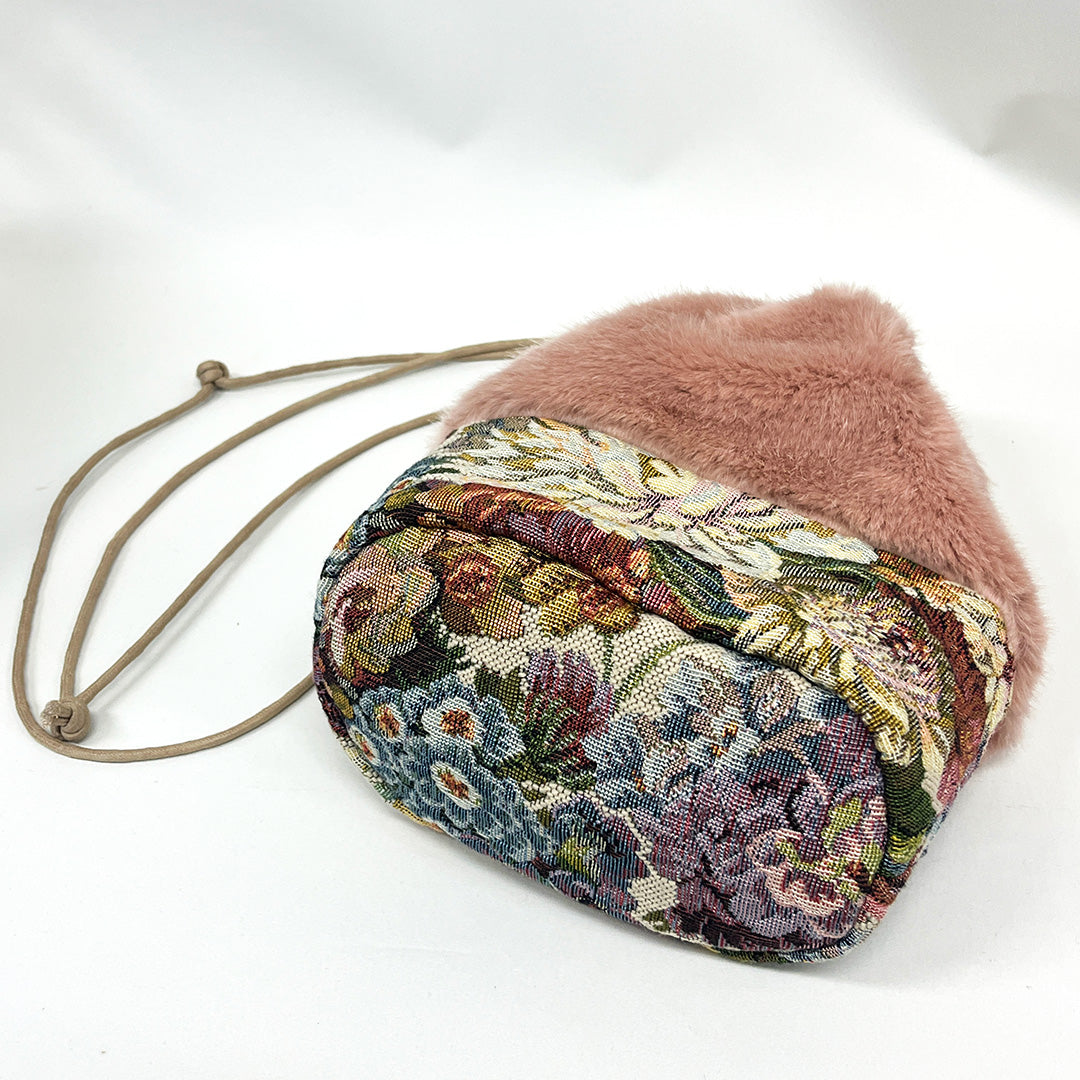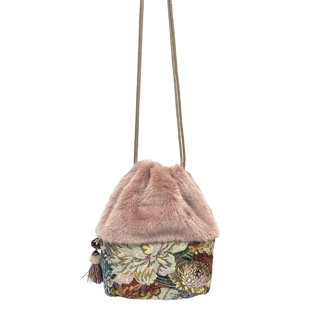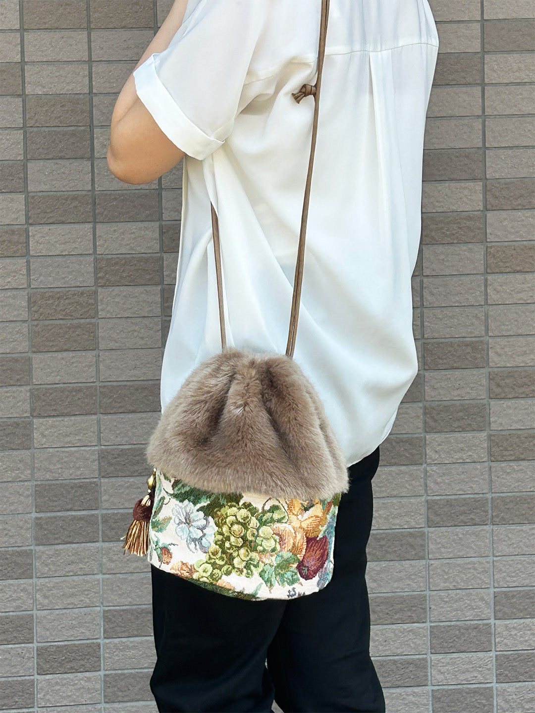 肩から掛けるマッシュルームのような、かわいいファーのバッグ。開閉は巾着式。大きく開くので、荷物の出し入れがとても便利です。秋冬シーズンにぴったりな、クラシックなガーデン模様のイタリア製ゴブランを使用。