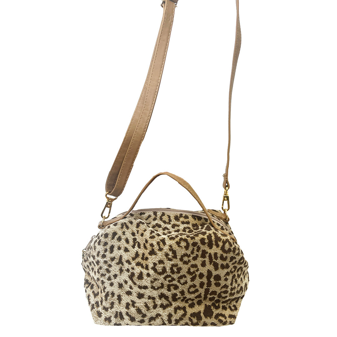 イタリア製ゴブラン生地を使用した落ち着きのあるアニマル柄のポシェットです。持ち手・ストラップには牛革を仕様。コロンとした形がかわいいバッグは、ファスナー開閉口が大きく開くので中の荷物を取り出しやすい形です。