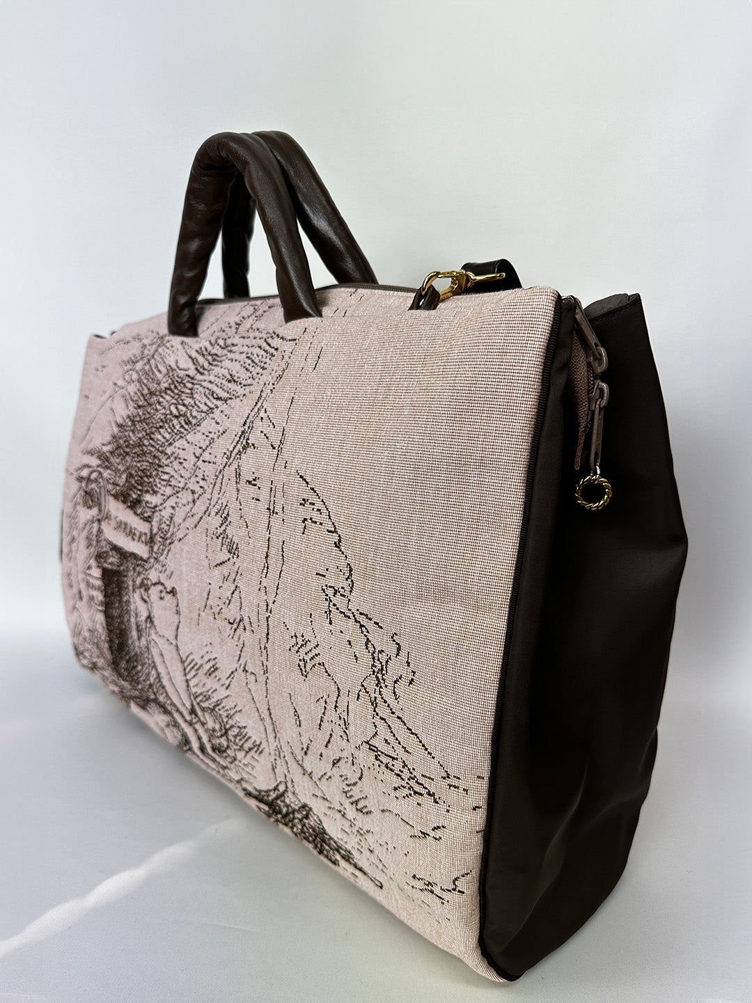 旅行だけでなく楽譜を入れて持ち歩くのにもぴったり。牛革の持ち手は柔らかな質感が手に馴染み、手への負担が少なめです。外側にファスナーポケットが2個あり、すぐに取り出したいスマホなどの収納に便利。バッグの底には鋲がついているので置くときにも安心です。牛革のショルダーストラップ付(長さ調整可)。